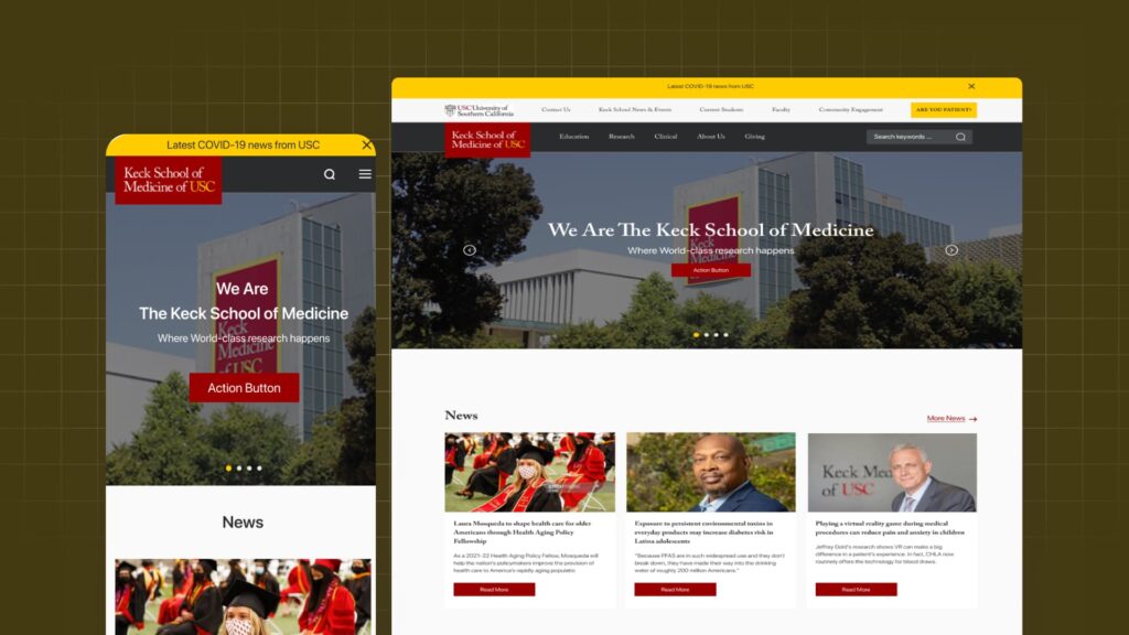 The University of Southern California (USC) is the oldest private research university in California, established in 1880 in the heart of Los Angeles. With 23 schools and almost 50,000 students, USC is a major institute with considerable demands on its website and digital assets. The Keck School of Medicine is a part of the university, and it stands out for its innovative approach to medical education, research, patient care, and community engagement. USC is a beacon for future leaders of health, industry, and academia, and we are proud to play a role in their mission of fostering knowledge and progress.