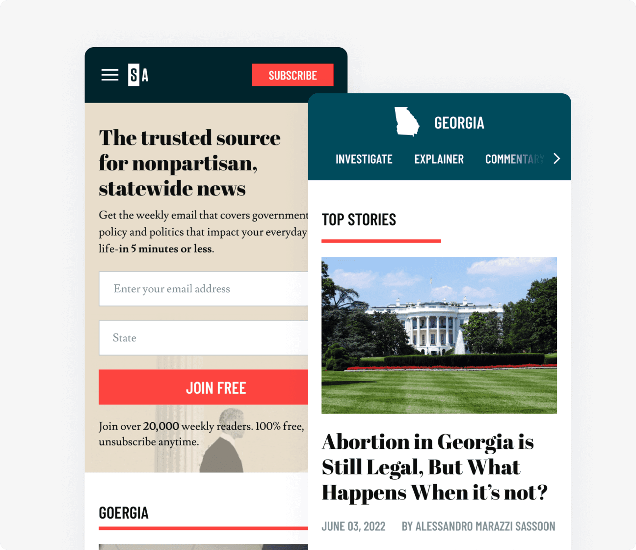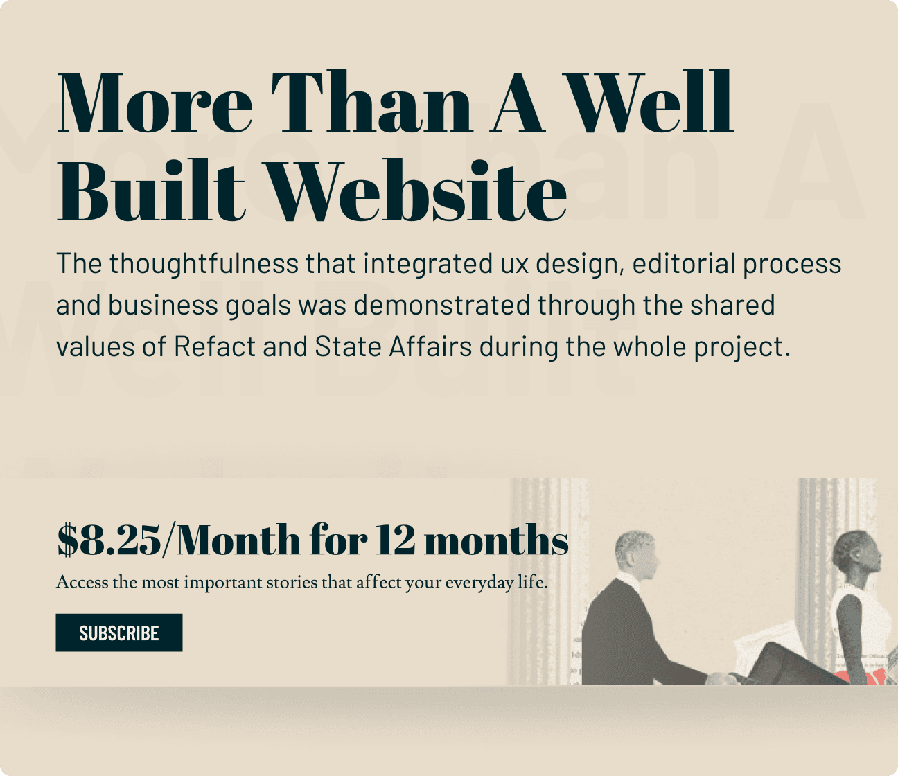 The goal of the site was to improve user experience, capture more emails, and convert them to subscribers. We looked at user behavior and carried out A/B testing to optimize flow and design. Our product and design team also collaborated with State Affairs members to create workflow mapping and relevant wireframes.